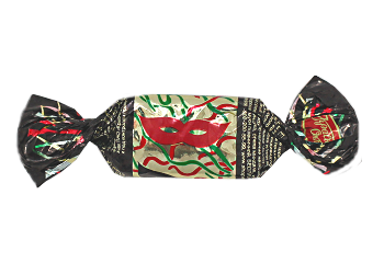Внешний вид фантика, с изображением карнавальной маски на золотом фоне, как нельзя лучше напомнит о весёлом и не забываемом празднике.